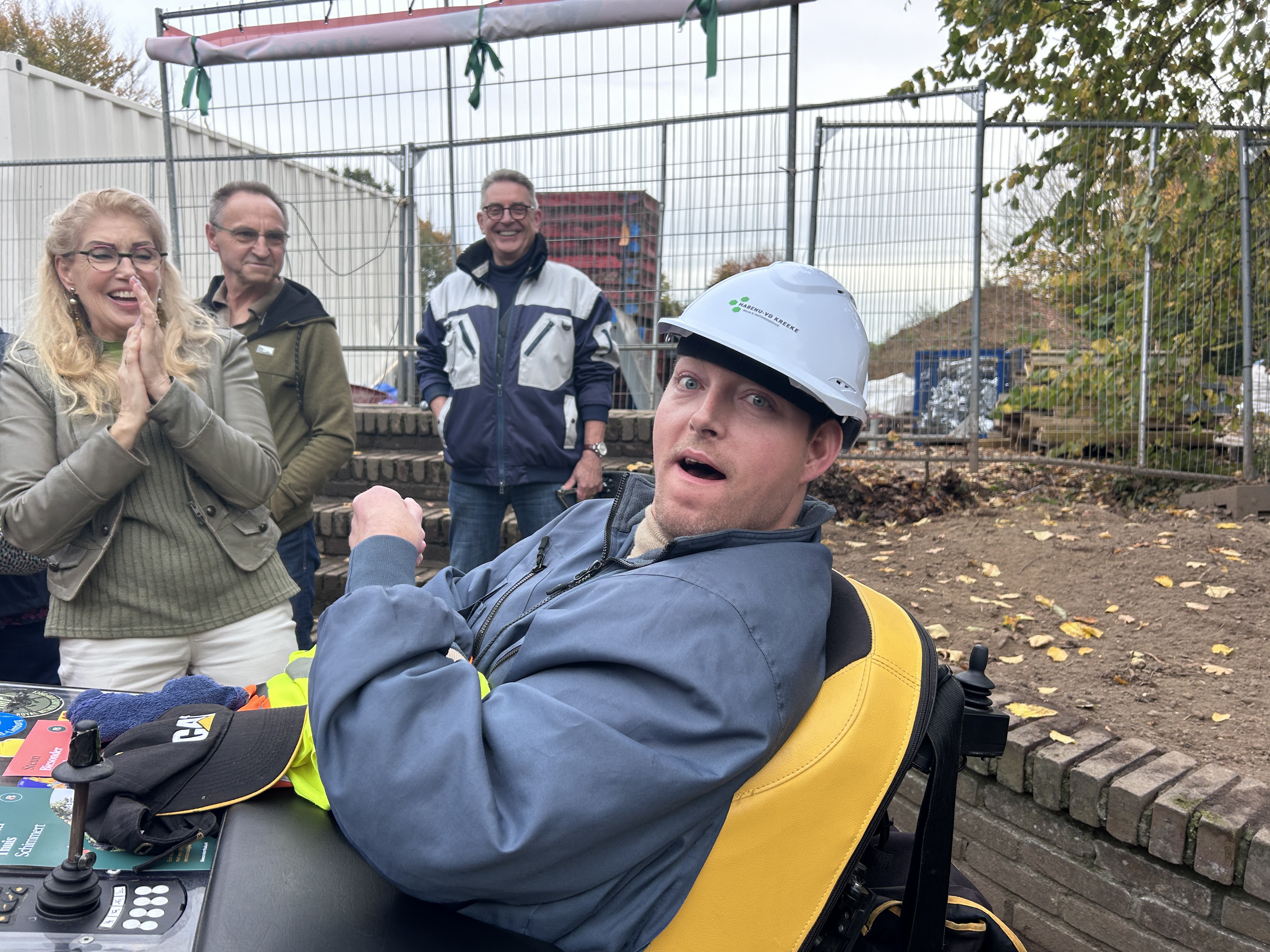 Een bijzonder moment volgde toen het bouwdoek werd onthuld – het symbool van wat hier groeit: meer dan een gebouw, een gemeenschap. En natuurlijk was er ook een glimlach toen één van de toekomstige bewoners symbolisch de bouwhelm opzette als ‘opzichter’ van dit mooie project.